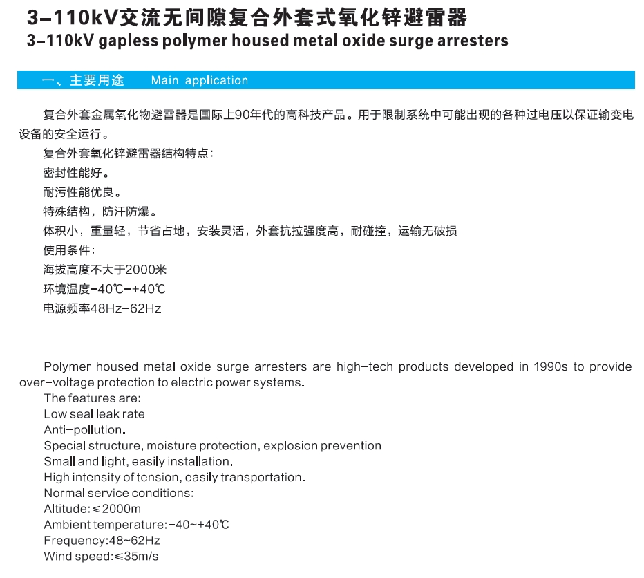 3-110KV Gapless Polymerhoused Metal Oxide Surge Arresters